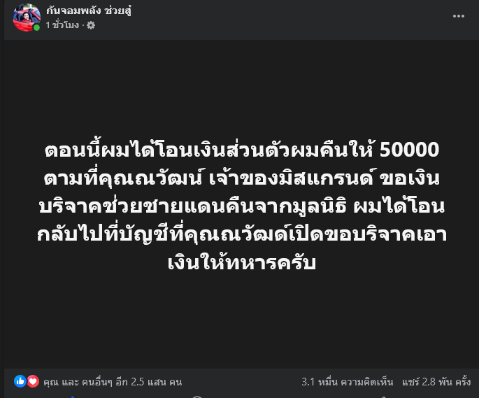 ล่าสุดวันที่ 27 ตุลาคม 2568 เฟซบุ๊ก กันจอมพลัง ช่วยสู้ ได้โพสต์ข้อความระบุว่า ตอนนี้ผมได้โอนเงินส่วนตัวผมคืนให้ 50000 ตามที่คุณณวัฒน์ เจ้าของมิสแกรนด์ ขอเงินบริจาคช่วยชายแดนคืนจากมูลนิธิ ผมได้โอนกลับไปที่บัญชีที่คุณณวัฒด์เปิดขอบริจาคเอาเงินให้ทหารครับ
