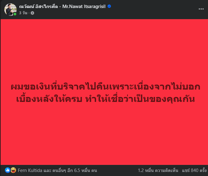 จากกรณีที่ก่อนหน้านี้ เมื่อวันที่ 23 ตุลาคม 2568 ที่ผ่านมา บอส ณวัฒน์ ได้โพสต์ข้อความระบุว่า ผมขอเงินที่บริจาคไปคืนเพราะเนื่องจากไม่บอกเบื้องหลังให้ครบ ทำให้เชื่อว่าเป็นของคุณกัน