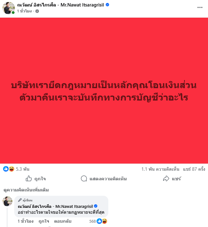 พร้อมระบุในคอมเมนต์ใต้โพสต์ดังกล่าวอีกว่า ผมได้แจ้งไปชัดเจนแล้วว่า ผมไม่รับเงินส่วนตัว มันไม่ถูกต้องตามกฎหมายของบริษัทมหาชน ซึ่งต่อมาในเวลาใกล้เคียงกัน บอส ณวัฒน์ ยังได้โพสต์อีกว่า บริษัทเรายึดกฎหมายเป็นหลัก คุณโอนเงินส่วนตัวมาคืน เราจะบันทึกทางการบัญชีว่าอะไร แลยังได้ย้ำอีกว่า อย่าทำอะไรตามใจ ขอให้ตามกฏหมายจะดีที่สุด