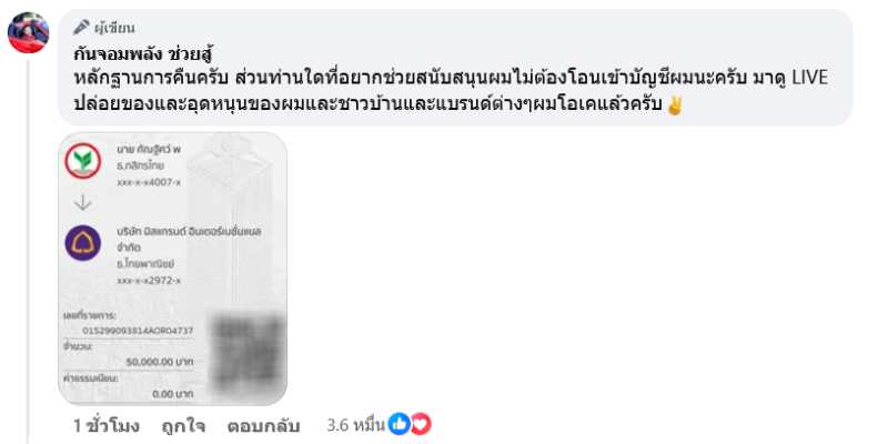นอกจากนี้ ยังได้แนบหลักฐานการโอนในคอมเมนต์ใต้โพสต์ดังกล่าว พร้อมระบุข้อความว่า หลักฐานการคืนครับ ส่วนท่านใดที่อยากช่วยสนับสนุนผมไม่ต้องโอนเข้าบัญชีผมนะครับ มาดู LIVE ปล่อยของ และอุดหนุนของผมและชาวบ้าน และแบรนด์ต่าง ๆ ผมโอเคแล้วครับ
