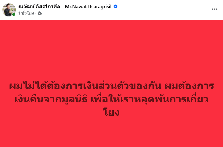 ล่าสุด ด้าน บอส ณวัฒน์ ได้ออกมาเคลื่อนไหวทันที หลัง กัน จอมพลัง ได้ทำการโอนเงินคืนให้ เป็นจำนวน 50,000 บาท โดยเจ้าตัวได้ออกมาโพสต์ข้อความผ่านเฟซบุ๊กส่วนตัว ณวัฒน์ อิสรไกรศีล - Mr.Nawat Itsaragrisil โดยระบุว่า ผมไม่ได้ต้องการเงินส่วนตัวของกัน ผมต้องการเงินคืนจากมูลนิธิ เพื่อให้เราหลุดพ้นการเกี่ยวโยง