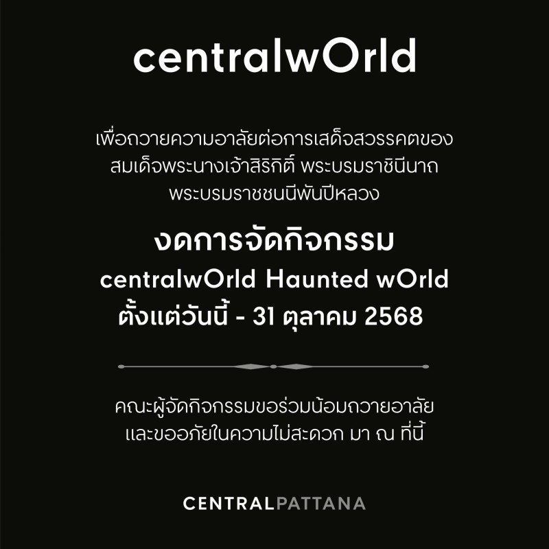 เซ็นทรัลเวิลด์ ขอแจ้งงดการจัดกิจกรรม centralwOrld Haunted World เพื่อถวายความอาลัยต่อการเสด็จสวรรคตของสมเด็จพระนางเจ้าสิริกิติ์ พระบรมราชินีนาถ พระบรมราชชนนีพันปีหลวง