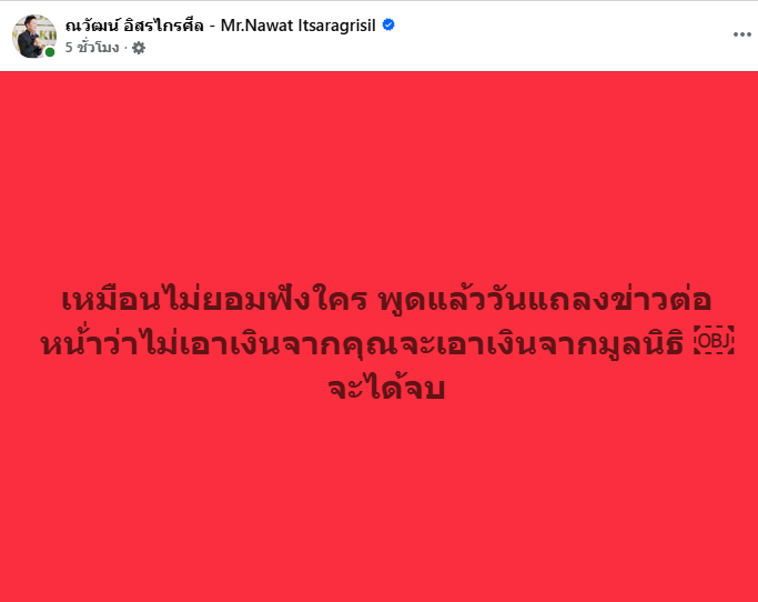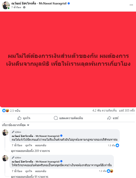 ด้านนายณวัฒน์ อิสรไกรศีล ได้โพสต์ข้อความผ่านเฟซบุ๊ก ณวัฒน์ อิสรไกรศีล - Mr.Nawat Itsaragrisil เช่นกันว่า ผมไม่ได้ต้องการเงินส่วนตัวของกัน ผมต้องการเงินคืนจากมูลนิธิ เพื่อให้เราหลุดพ้นการเกี่ยวโยง