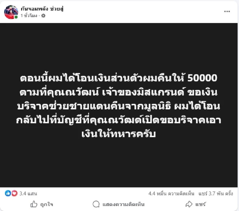 กันระบุในโพสต์ว่า ตอนนี้ผมได้โอนเงินส่วนตัวผมคืนให้ 50,000 ตามที่คุณณวัฒน์ เจ้าของมิสแกรนด์ ขอเงินบริจาคช่วยชายแดนคืนจากมูลนิธิ ผมได้โอนกลับไปที่บุญชีที่คุณณวัฒน์เปิดขอบริจาคเอาเงินให้ทหารครับ