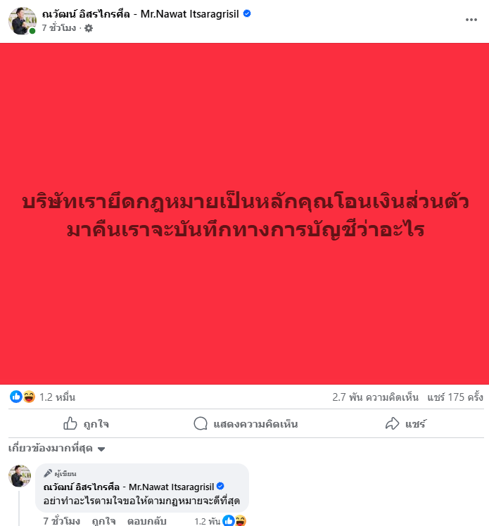 ต่อมา นายณวัฒน์ โพสต์เพิ่มเติมว่า บริษัทเรายึดกฎหมายเป็นหลักคุณโอนเงินส่วนตัวมาคืน เราจะบันทึกทางการบัญชีว่าอะไร พร้อมคอมเมนต์เพิ่มเติมว่า อย่าทำอะไรตามใจขอให้ตามกฏหมายจะดีที่สุด