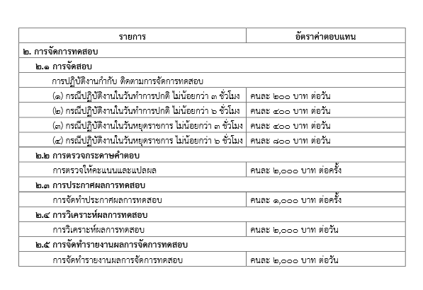 ส่วนการจัดทำสอบ ทั้งการปฎิบัติงานและติดตามการจัดทดสอบ ตั้งแต่ไม่น้อยกว่า 3 ชั่วโมงจนถึงไม่น้อยกว่า 6 ชั่วโมงได้รับค่าตอบแทนคนละ 200-800 บาทต่อวัน การตรวจกระดาษคำตอบ การตรวจให้คะแนนและแปลผล ได้รับคนละ 2,000 บาท/ครั้ง การจัดทำประกาศผลการทดสอบได้รับค่าตอบแทนคนละ 1,000 บาท/ครั้ง (ดูรายละเอียดในบัญชีแนบท้ายเพิ่มเติม)