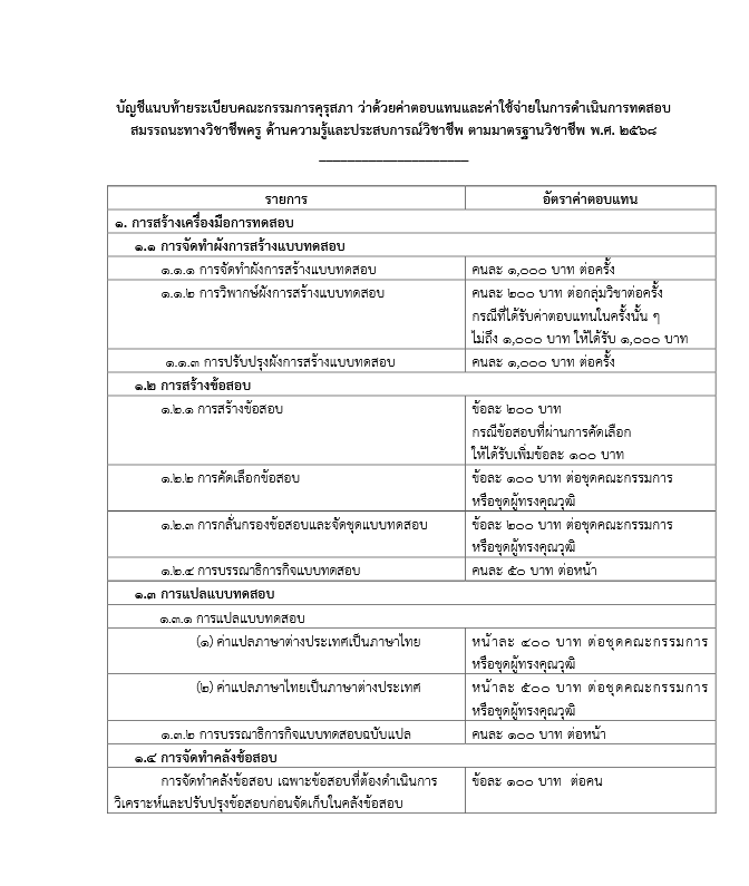 ส่วนบัญชีแนบท้ายระเบียบคณะกรรมการคุรุสภา ว่าด้วยค่าตอบแทนและค่าใช้จ่ายในการดำเนินการทดสอบสมรรถนะทางวิชาชีพครู ด้านความรู้และประสบการณ์วิชาชีพตามมาตรฐานวิชาชีพ พ.ศ. 2568 ระบุรายการดังนี้ เช่น การสร้างเครื่องมือการทดสอบ ในส่วนของการจัดทำผังการสร้างแบบทดสอบ ให้จ่ายอัตราค่าตอบแทนคนละ 1,000 บาทต่อครั้ง
