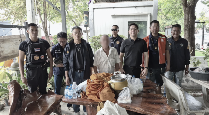 เมื่อเจ้าหน้าที่เดินทางถึงพื้นที่ พบบุคคลแต่งกายเป็นพระสงฆ์ ขับรถเก๋งสีบรอนซ์ทองมาจอดใกล้แผงค้า ก่อนเปิดท้ายรถหยิบอุปกรณ์และเดินมาปักหลักยืนบิณฑบาตหน้าแผงขายของ เจ้าหน้าที่จึงแสดงตัวตรวจสอบเอกสาร พบชื่อ หลวงพ่อศักดิ์ หรือ นายสุทธิ์ศักดิ์ จันทโรธร อายุ 82 ปี