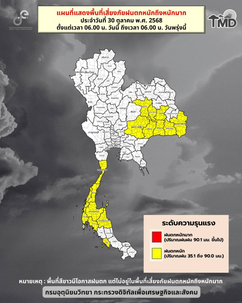 วันที่ 30 ต.ค.2568 กรมอุตุนิยมวิทยา พยากรณ์อากาศ 24 ชั่วโมงข้างหน้า ประเทศไทยมีฝนเพิ่มขึ้น และมีฝนตกหนักบางแห่งในภาคตะวันออกเฉียงเหนือตอนล่างและภาคใต้ โดยเฉพาะจังหวัดร้อยเอ็ด มหาสารคาม นครราชสีมา บุรีรัมย์ สุรินทร์ ศรีสะเกษ กาญจนบุรี ประจวบคีรีขันธ์ ชุมพร สุราษฎร์ธานี ระนอง พังงา และภูเก็ต
