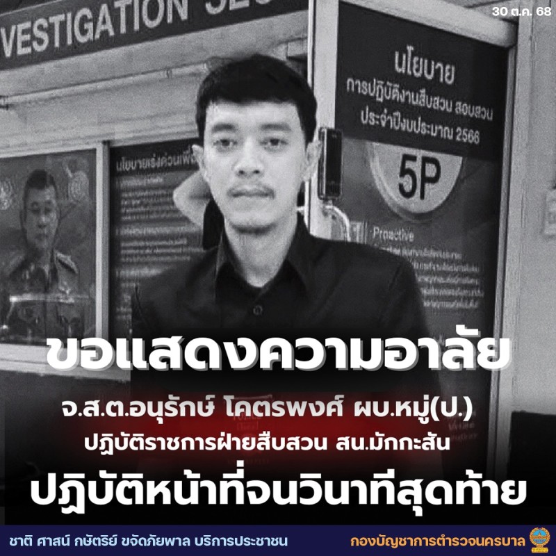 เมื่อวันที่ 30 ตุลาคม 2568 เพจเฟซบุ๊ก กองบัญชาการตำรวจนครบาล - บช.น. Metropolitan Police Bureau เผยเเพร่รูปภาพพร้อมข้อความ อาลัยตำรวจกล้า จ.ส.ต.อนุรักษ์ โคตรพงศ์ ผบ.หมู่ (ป.) ปฏิบัติราชการฝ่ายสืบสวน สน.มักกะสัน โดยระบุว่า ขอแสดงความอาลัย ตำรวจมักกะสันเสียชีวิตขณะปฏิบัติหน้าที่