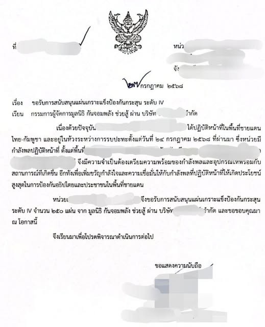 กัน จอมพลัง ได้นำ หนังสือขอความอนุเคราะห์ จากหน่วยงานทหารแห่งหนึ่งมาแสดงต่อที่ประชุม โดยได้อ่านเนื้อหาใจความสำคัญ ซึ่งระบุว่า หน่วยงานมีความต้องการเงินไปซื้อของใช้จากบริษัทแห่งหนึ่ง จึงมาขอความอนุเคราะห์เงินจากมูลนิธิ [กัน จอมพลัง] เพื่อไปซื้อของที่ต้องการใช้ อาทิ แผ่นเกราะแข็งป้องกันกระสุนระดับ 4 จำนวน 250 แผ่น