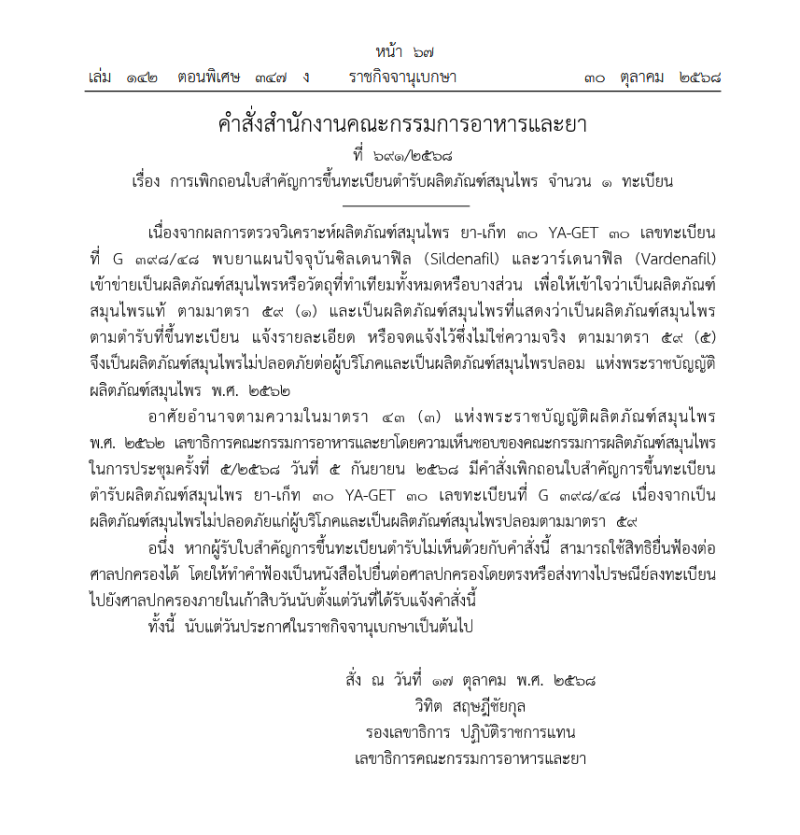 อาศัยอำนาจตามความในมาตรา 43 (3) แห่งพระราชบัญญัติผลิตภัณฑ์สมุนไพร พ.ศ. 2529 เลขาธิการคณะกรรมการอาหารและยาโดยความเห็นชอบของคณะกรรมการผลิตภัณฑ์สมฑ์สมนไพร ในการประชุมครั้งที่ 5/2568 วันที่ 5 กันยายน 2568 มีคำสั่งเพิกถอนใบใบสำคัญการขึ้นทะเบียน ตำรับผลิตภัณฑ์สมุนไพร ยา-เก็ท 30 YA-GET 30 เลขทะเบียนที่ G 389/48 เนื่องจากเป็น ผลิตภัณฑ์สมุนไพรไม่ปลอดภัยแก่ผู้บริโภคและเป็นผลิตภัณฑ์สมุนไพรปลอมตามมาตรา 59
