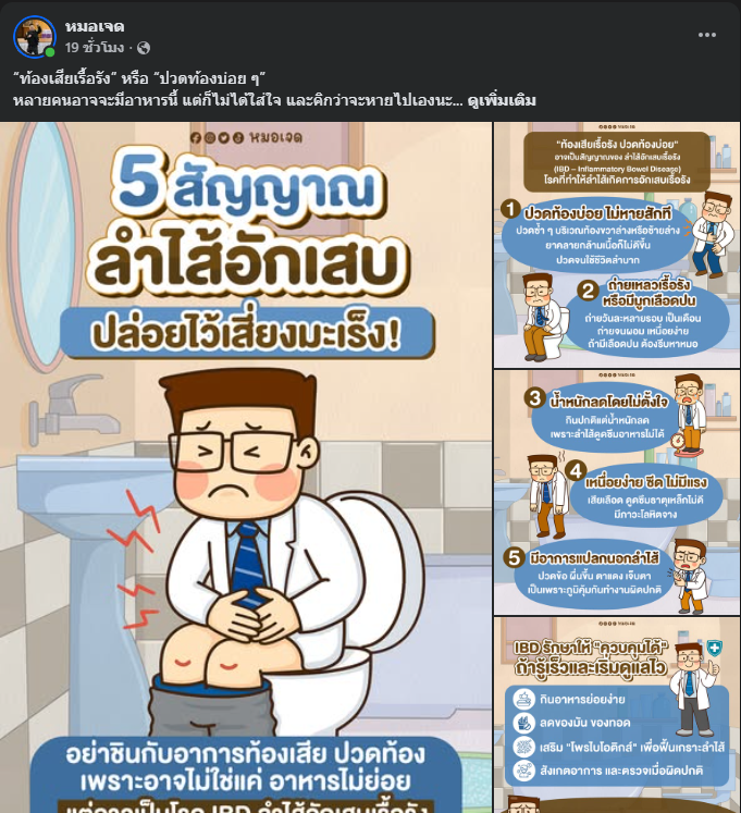 วันที่ 31 ต.ค.2568 นพ.เจษฎ์ บุณยวงศ์วิโรจน์ รองผู้อำนวยการโรงพยาบาลมหาราชนครราชสีมา โพสต์ภาพข้อความผ่านเพจเฟซบุ๊กชื่อ หมอเจด ระบุว่า ท้องเสียเรื้อรัง หรือ ปวดท้องบ่อย ๆ หลายคนอาจจะมีอาหารนี้ แต่ก็ไม่ได้ใส่ใจ และคิกว่าจะหายไปเองนะ จริงๆแล้วมันคืออาการที่ลำไส้กำลังผิดปกติ เราเรียกโรคนี้ว่า Inflammatory Bowel Disease (IBD) ซึ่งเป็นกลุ่มโรคที่ทำให้ลำไส้ของเรามีการอักเสบแบบเรื้อรัง ที่พบบ่อยมี 2 โรค คือ Crohn’s disease: อักเสบได้ทุกส่วนของระบบทางเดินอาหาร ตั้งแต่ปากไปจนถึงรูทวาร , Ulcerative colitis: จะอักเสบแค่ที่ลำไส้ใหญ่เท่านั้น โดยเริ่มจากล่างสุดแล้วลามขึ้นไป