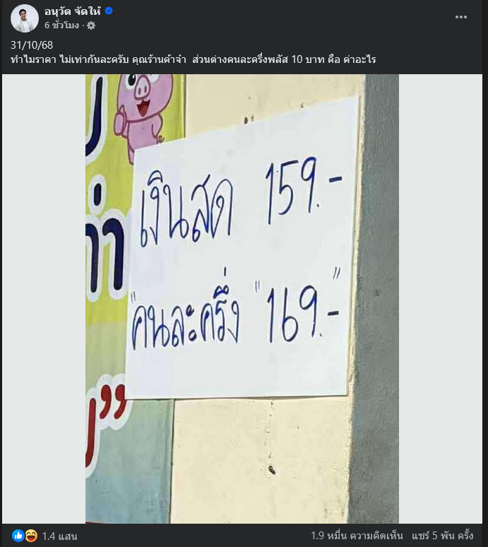 วันที่ 31 ตุลาคม 2568 มีรายงานว่า เพจเฟซบุ๊ก อนุวัต จัดให้ ได้โพสต์ภาพพร้อมข้อความระบุว่า 31/10/68 ทำไมราคา ไม่เท่ากันละครับ คุณร้านค้าจ๋า ส่วนต่างคนละครึ่งพลัส 10 บาท คือ ค่าอะไร