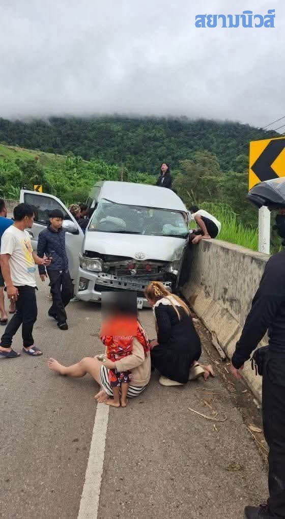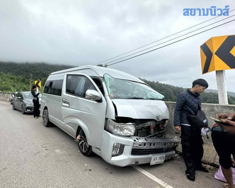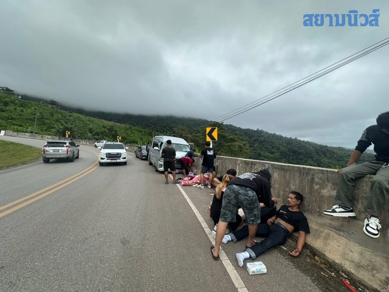 ในจุดเกิดเหตุพบรถตู้นักท่องเที่ยว ยี่ห้อโตโยต้า สีบอล หมายเลขทะเบียน นจ 1619 นนทบุรี มีนักท่องเที่ยวชาย หญิง อยู่ในรถทั้งหมด 12 คน รถเสียหลักพุ่งชนขอบทาง ด้านหน้ารถฝั่งซ้าย ตัวรถด้านซ้ายชนกับขอบทางได้รับความเสียหายหนัก