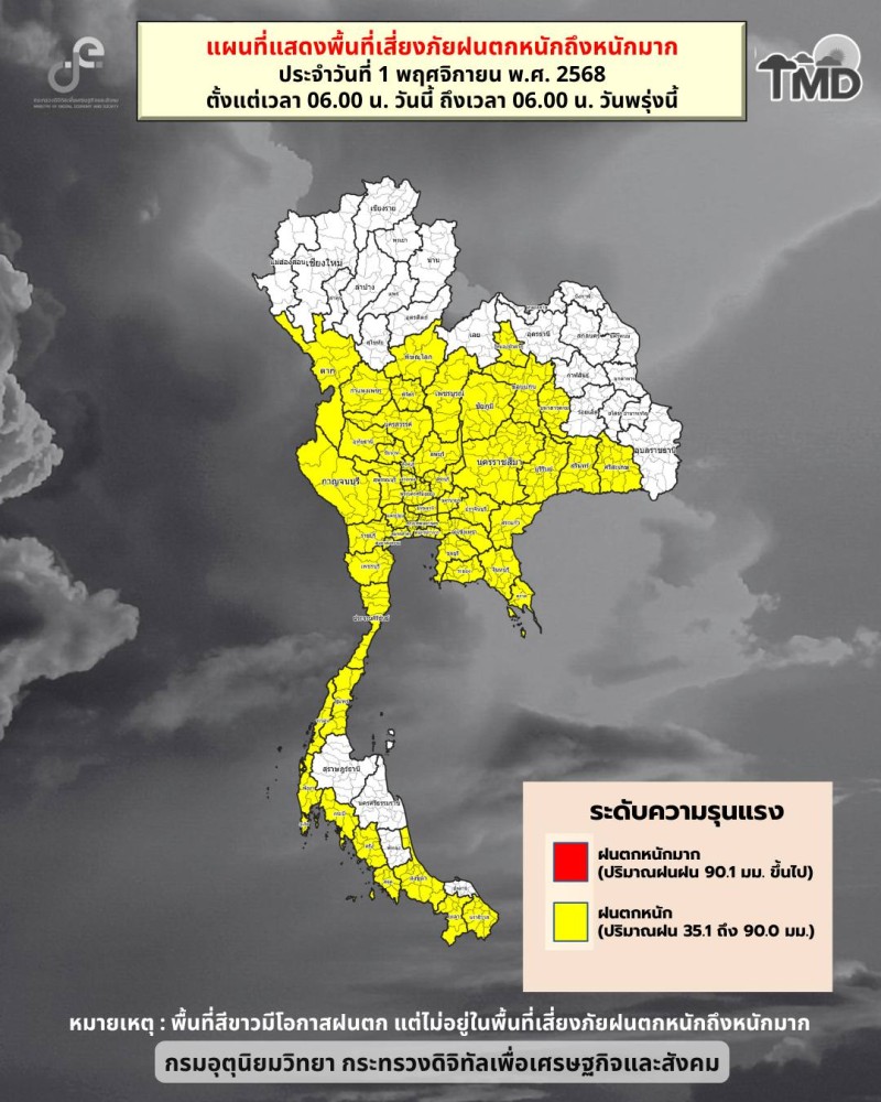 โดยร่องมรสุมกำลังแรงยังคงพาดผ่านภาคใต้ตอนบนและอ่าวไทยตอนบน ประกอบกับมีลมตะวันออกและลมตะวันออกเฉียงใต้พัดปกคลุมภาคเหนือและภาคกลาง ในขณะที่บริเวณความกดอากาศสูงหรือมวลอากาศเย็นกำลังอ่อนปกคลุมประเทศไทยตอนบน ขอให้เกษตรกรเตรียมการป้องกันและระวังความเสียหายที่จะเกิดต่อผลผลิตทางการเกษตร รวมทั้งดูแลรักษาสุขภาพเนื่องจากสภาพอากาศที่เปลี่ยนแปลง เพิ่มความระมัดระวังในการสัญจรผ่านบริเวณที่มีฝนตก และระวังอันตรายจากฝนตกหนัก ซึ่งอาจทำให้เกิดน้ำท่วมได้ในบางพื้นที่