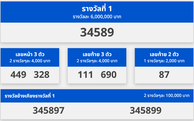 ออกไปเป็นที่เรียบร้อยแล้ว สำหรับการประกาศผลรางวัลสลากกินแบ่งรัฐบาลประจำวันที่ 1 พฤศจิกายน 2568 โดยผลการออกรางวัลมีดังนี้ รางวัลที่ 1 รางวัลละ 6,000,000 บาท 345898 เลขหน้า 3 ตัว 2 รางวัลๆละ 4,000 บาท 449 328 เลขท้าย 3 ตัว 2 รางวัลๆละ 4,000 บาท 111 690 เลขท้าย 2 ตัว 1 รางวัลๆละ 2,000 บาท 87