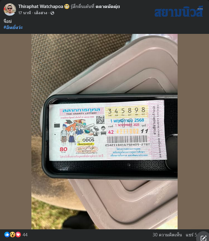 ล่าสุด จากการตรวจสอบโลกออนไลน์พบว่า ผู้ใช้เฟซบุ๊กชื่อ Thiraphat Watchapoa ได้โพสต์ภาพลอตเตอรี่รางวัลที่ 1 พร้อมระบุข้อความว่า จือบ่ อิหยั่งว่ะ