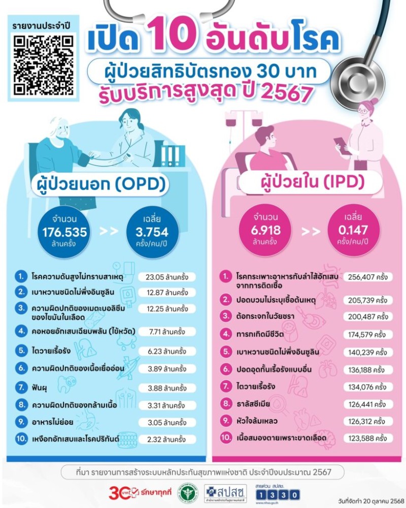 เมื่อวันที่ 2 พฤศจิกายน 2568 สำนักงานหลักประกันสุขภาพแห่งชาติ นพ.จเด็จ ธรรมธัชอารี เลขาธิการสำนักงานหลักประกันสุขภาพแห่งชาติ เผยรายงานผลการดำเนินงานของระบบหลักประกันสุขภาพแห่งชาติ (บัตรทอง 30 บาท) ปีงบประมาณ 2567 โดยรายงานดังกล่าวสะท้อนภาพรวมการเจ็บป่วยของประชาชนผู้ใช้สิทธิบัตรทองทั่วประเทศ พบว่า โรคความดันโลหิตสูงไม่ทราบสาเหตุ ยังคงครองอันดับ 1 ของผู้ป่วยนอก ขณะที่โรคกระเพาะอาหารและลำไส้อักเสบจากการติดเชื้อ เป็นโรคที่พบมากที่สุดในผู้ป่วยใน
