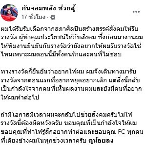 แต่สิ่งนี้กลับเป็นกำลังใจจากคนที่เห็นผลงานผมและยังมีคนที่อยากให้ผมทำต่อไป ถ้ามีโอกาสมีเวลาผมจะกลับไปช่วยสังคมครับไม่ให้รางวัลนี้ต้องผิดหวัง อบคุณที่เป็นกำลังใจให้ผมขอบคุณที่ทำให้รู้สึกอยากทำต่อและขอบคุณ FC ทุกคนที่เคียงข้างผมในทุกช่วงเวลาครับ