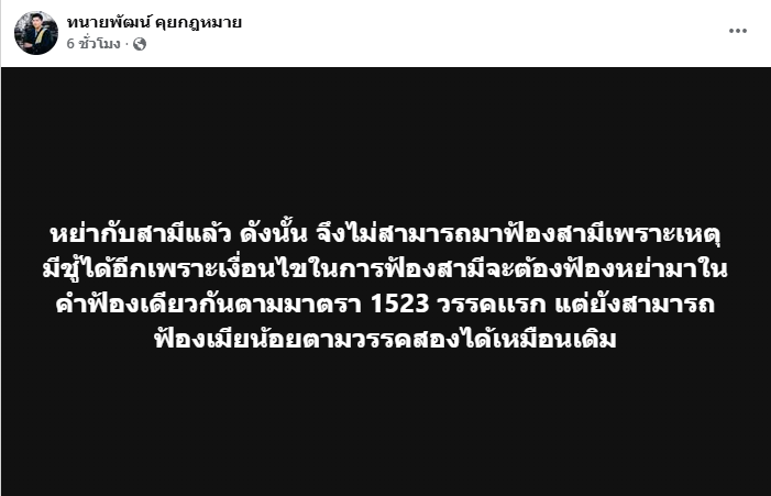 เมื่อวันที่ 3 พฤศจิกายน 2568 ทนายพัฒน์ หรือที่รู้จักกันในชื่อ ทนายเมียหลวง ได้โพสต์ข้อกฎหมายเกี่ยวกับการฟ้องชู้ ผ่านเฟซบุ๊ก ทนายพัฒน์ คุยกฎหมาย โดยระบุว่า