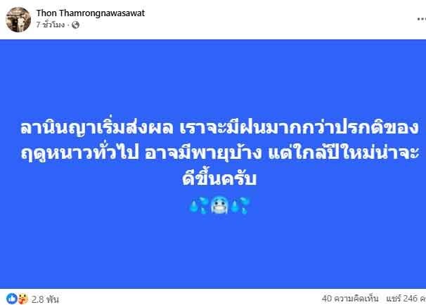 โดยระบุว่า ลานีญาเริ่มส่งผล เราจะมีฝนมากกว่าปกติของฤดูหนาวทั่วไป อาจมีพายุบ้าง แต่ใกล้ปีใหม่น่าจะดีขึ้นครับ
