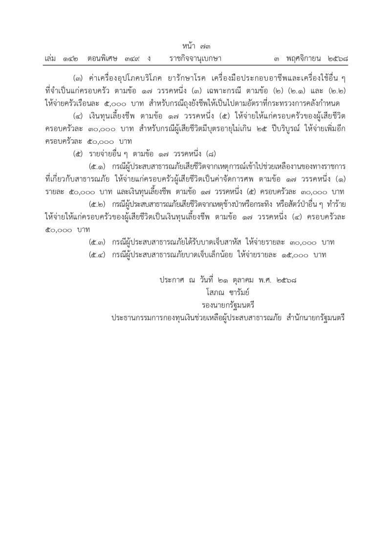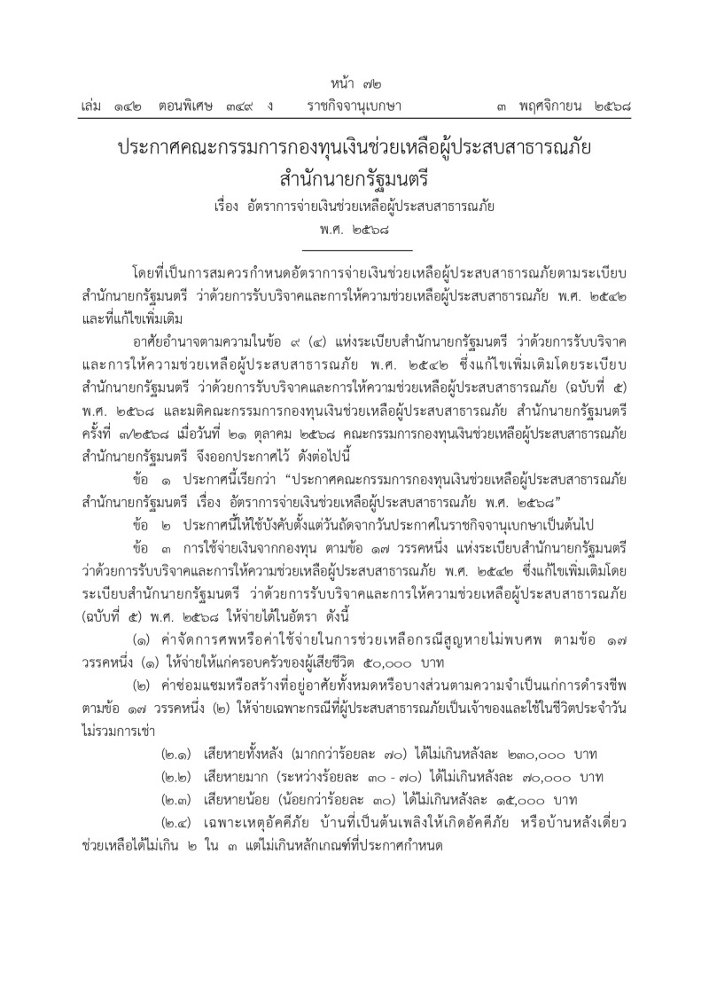 เมื่อวันที่ 3 พฤศจิกายน 2568 เว็บไซต์ราชกิจจานุเบกษา เผยแพร่ประกาศ คณะกรรมการกองทุนเงินช่วยเหลือผู้ประสบสาธารณภัย สำนักนายกรัฐมนตรี เรื่อง อัตราการจ่ายเงินช่วยเหลือผู้ประสบสาธารณภัย พ.ศ. 2568