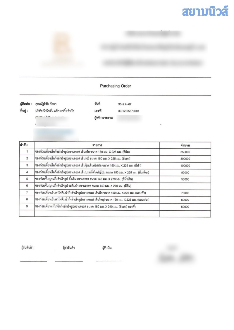 นายณัฐธิชัย กัลยา อายุ 58 ปี บอกว่า ตนเองได้ประกอบธุรกิจเกี่ยวกับการออกแบบบรรจุภัณฑ์ (แพคเกจจิ้ง) ซึ่งทำให้บริษัทชื่อดังหลายแห่ง โดยเมื่อประมาณ เดือนพฤศจิกายน 2567 ที่ผ่านมา ตนเองได้รู้จักนักธุรกิจหญิงที่เป็นเจ้าของผลิตภัณฑ์ก๋วยเตี๋ยวกึ่งสำเร็จรูป ผ่านคนรู้จักโดยได้มีการเจรจาธุรกิจกันกระทั่งได้เดินทางมาดูงานที่โรงงาน ก่อนจะมีการว่าจ้างให้ผลิตซองให้ และมาทราบภายหลังว่าการที่มีการนำใบสั่งซื้อจากตัวแทนมาให้ดู เป็นเพียงกลอุบายที่จะใช้ไปหลอกเงินจากตัวแทนจำหน่าย โดยเมื่อตัวแทนเห็นภาพว่ามีการสั่งผลิตซองจริงจึงเชื่อมั่นและจ่ายเงินค่าสินค้า ซึ่งตอนนี้ตนเองได้รับการติดต่อมาจากตัวแทนจำหน่ายแล้วหลายรายว่าถูกมีการหลอกในพฤติกรรมคล้ายกัน ซึ่งบางรายโดน 2 ล้าน บางรายถูกหลอกไปนับ 10 ล้านบาท และประเมินคาดว่าน่าจะมีความเสียหายไปถึง 50 ล้านบาท