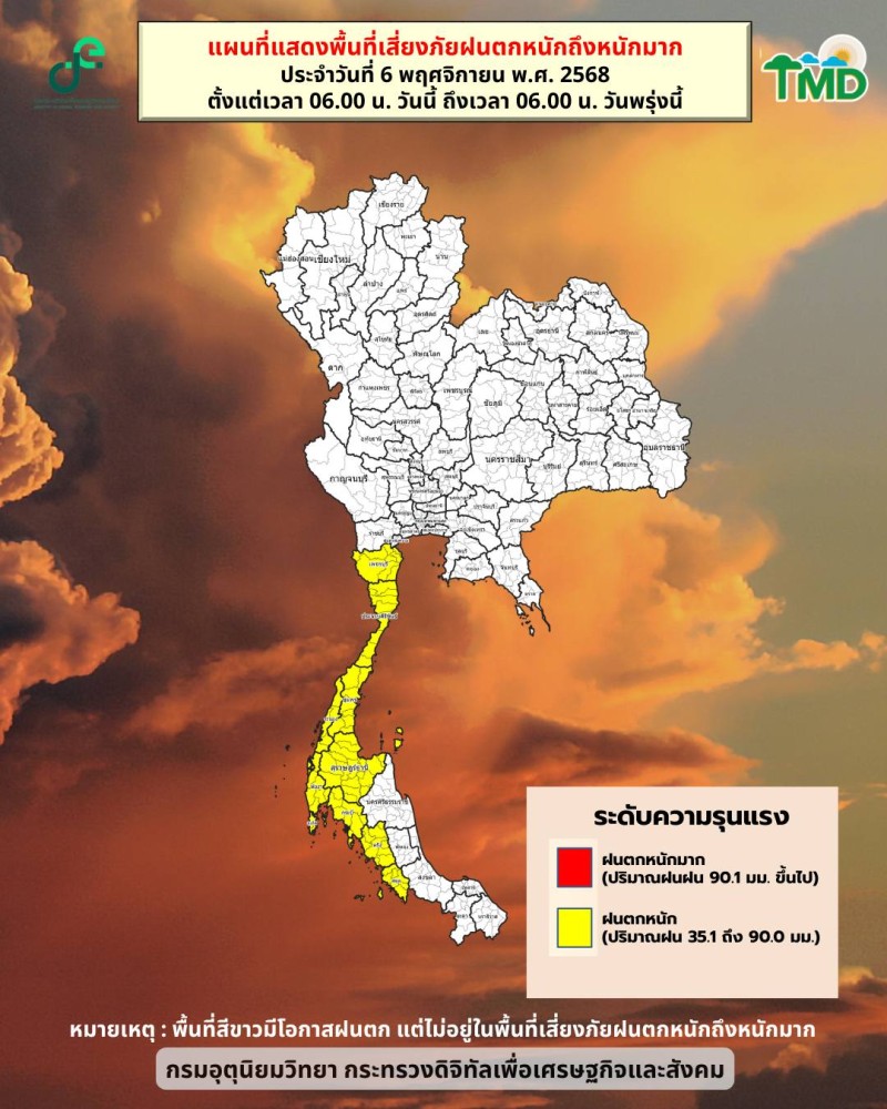 ออกประกาศ 06 พฤศจิกายน 2568 พยากรณ์อากาศสำหรับประเทศไทย 06:00 น. วันนี้ ถึง 06:00 น. วันพรุ่งนี้