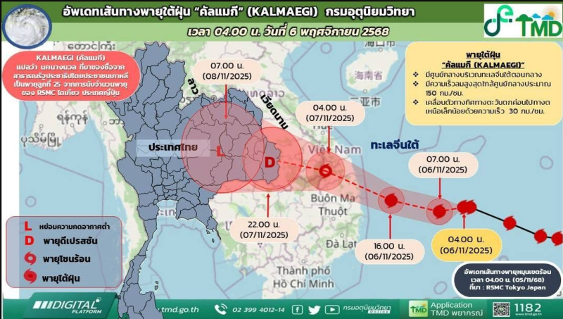 วันที่ 6 พ.ย.2568 กรมอุตุนิยมวิทยา อัปเดตเส้นทางพายุไต้ฝุ่น คัลแมกี (KALMAEGI) ประจำวันที่ 6 พ.ย. 68 เวลาเช้า ระบุว่า พายุไต้ฝุ่น คัลแมกี มีศูนย์กลางอยู่บริเวณ ทะเลจีนใต้ตอนกลาง (ห่างจากชายฝั่งประเทศเวียดนามราว 500 กิโลเมตร)
