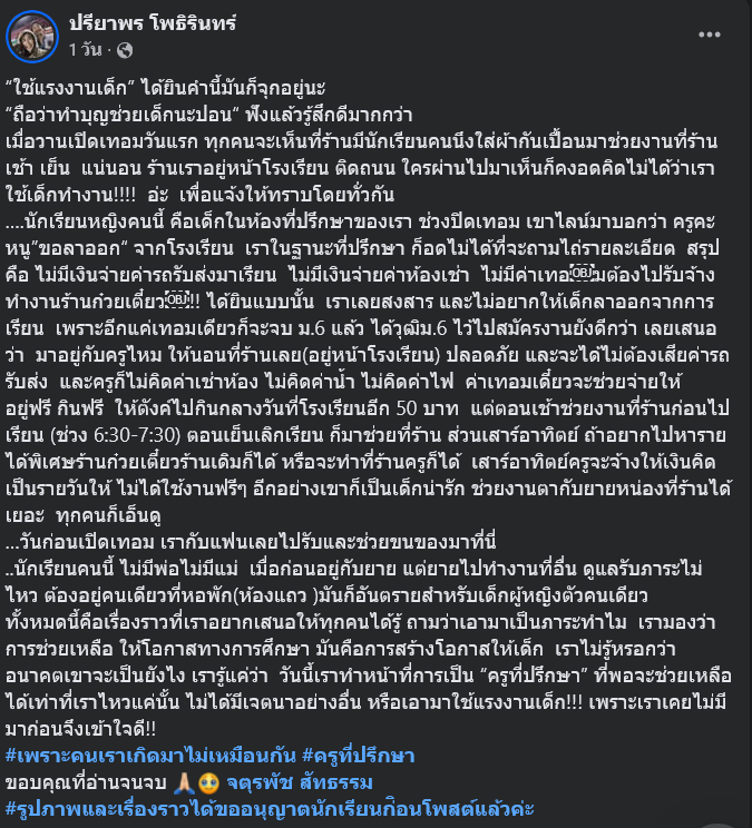 วันที่ 6 พฤศจิกายน 2568 ผู้สื่อข่าวรายงานว่า โลกออนไลน์มีการแชร์เรื่องราวของผู้ใช้เฟซบุ๊กรายหนึ่งชื่อ ปรียาพร โพธิรินทร์ ซึ่งเป็นคุณครู ได้โพสต์ภาพของนักเรียนพร้อมระบุข้อความว่า ใช้แรงงานเด็ก ได้ยินคำนี้มันก็จุกอยู่นะ ถือว่าทำบุญช่วยเด็กนะปอน ฟังแล้วรู้สึกดีมากกว่า เมื่อวานเปิดเทอมวันแรก ทุกคนจะเห็นที่ร้านมีนักเรียนคนนึงใส่ผ้ากันเปื้อนมาช่วยงานที่ร้าน เช้า เย็น แน่นอน ร้านเราอยู่หน้าโรงเรียน ติดถนน ใครผ่านไปมาเห็นก็คงอดคิดไม่ได้ว่าเราใช้เด็กทำงาน อ่ะ เพื่อแจ้งให้ทราบโดยทั่วกัน