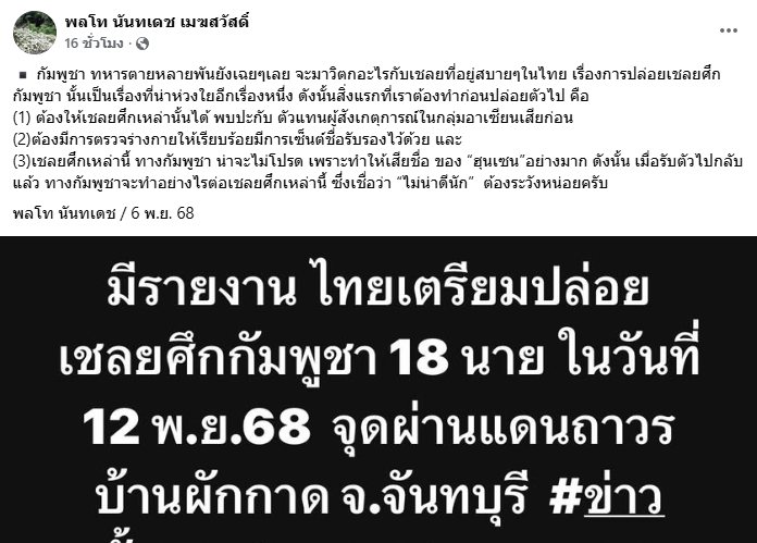 จากกรณีที่ไทยเตรียมปล่อยตัวทหารกัมพูชา 18 นาย ซึ่งเป็นเชลยศึก ในวันที่ 12 พฤศจิกายน นี้