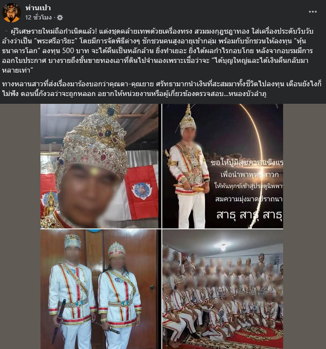 เมื่อวันที่ 7 พฤศจิกายน 2568 ที่ผ่านมา เพจดังอย่าง ท่านเปา ได้โพสต์ข้อความแฉวีรกรรม ผู้วิเศษลึกลับรายใหม่ โดยระบุว่า ผู้วิเศษรายใหม่ถือกำเนิดแล้ว แต่งชุดคล้ายเทพด้วยเครื่องทรง สวมมงกุฎชฎาทอง ใส่เครื่องประดับวิบวับ อ้างว่าเป็น พระศรีอาริยะ โดยมีการจัดพิธีต่าง ๆ ชักชวนคนสูงอายุเข้ากลุ่ม พร้อมกับชักชวนให้ลงทุน หุ้นธนาคารโลก ลงทุน 500 บาท จะได้คืนเป็นหลักล้าน ยิ่งทำเยอะ ยิ่งได้ผลกำไรกอบโกย