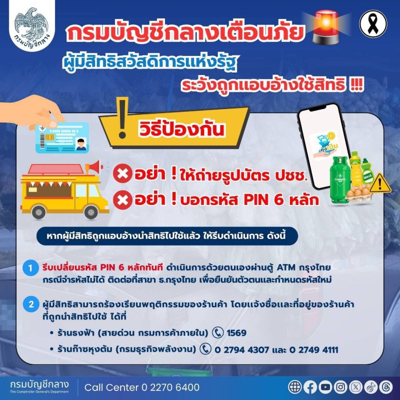 ทั้งร้านธงฟ้าและร้านค้าก๊าซหุงต้ม แล้วทำการตัดวงเงินสิทธิสวัสดิการแห่งรัฐของผู้มีสิทธิในเดือนถัดไป ทำให้ผู้มีสิทธิไม่สามารถใช้สิทธิได้ และเมื่อผู้มีสิทธิโทรไปตรวจสอบกับ Call Center บัตรสวัสดิการแห่งรัฐ 0 2109 2345 พบว่าสิทธิของท่านถูกนำไปใช้กับร้านค้าที่อยู่ข้ามพื้นที่ในต่างจังหวัดแล้ว ทั้งที่ไม่เคยเดินทางไปยังจังหวัดนั้น ๆ ดังนั้น ขอให้ผู้มีสิทธิสวัสดิการแห่งรัฐโปรดระมัดระวัง ไม่ควรให้บัตรประจำตัวประชาชนหรือบอก PIN Code 6 หลัก กับร้านค้าหรือรถเร่ ที่ไม่น่าเชื่อถือโดดเด็ดขาด