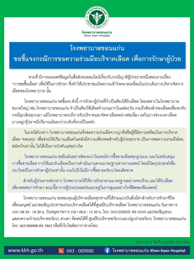 โรงพยาบาลขอนแก่น ขอยืนยันอย่างชัดเจนว่า ไม่เคยมีการซื้อขายเxือดทุกรูปแบบ และไม่สนับสนุนการซื้อขายเxือด การให้และรับเxือดเป็นการดำเนินงานตามมาตรฐานทางการแพทย์ โดยมีวัตถุประสงค์เพื่อประโยชน์ในการรักษาผู้ป่วยเท่านั้น รวมถึงไม่มีการซื้อขายอวัยวะโดยเด็ดขาด