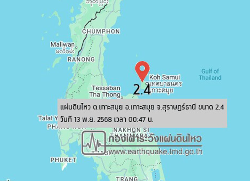 เมื่อเวลา 00:47 น.วันที่ 13 พ.ย.2568 กองเฝ้าระวังแผ่นดินไหว กรมอุตุนิยมวิทยา รายงานว่า เกิดแผ่นดินไหว บริเวณต.เกาะสมุย อ.เกาะสมุย จ.สุราษฎร์ธานีแผ่นดินไหวครั้งนี้ โดยมีจุดศูนย์กลางอยู่ที่ละติจูด 9.550°N, ลองจิจูด 99.956°E ขนาด 2.4 ความลึก 4 กม.