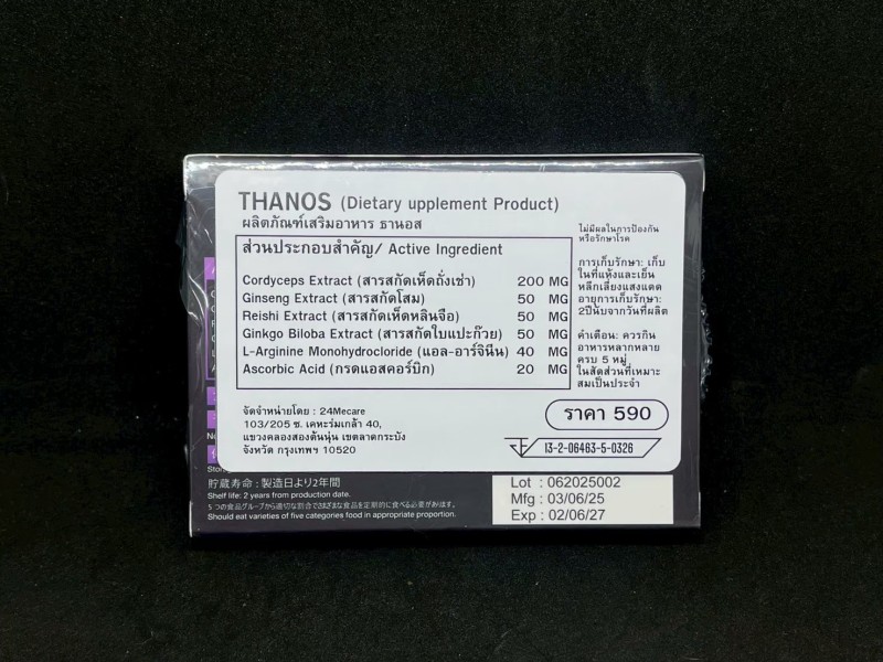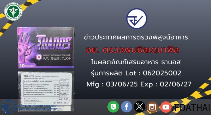 เมื่อวันที่ 13 พฤศจิกายน 2568 สำนักงานคณะกรรมการอาหารและยา (อย.) ได้ตรวจสอบผลิตภัณฑ์เสริมอาหารที่จำหน่ายผ่านร้านค้าแพลตฟอร์มออนไลน์ พบว่า ผลิตภัณฑ์เสริมอาหาร ธานอส เลขสารบบอาหาร 13-2-06463-5-0326 รุ่นการผลิต Lot 062025002 Mfg 03/06/25 Exp 02/06/27 มีการปนเปื้อนของยาแผนปัจจุบันซิลเดนาฟิล (Sildenafil) ซึ่งจัดเป็นยาควบคุมพิเศษ ต้องมีใบสั่งแพทย์จึงจะสามารถซื้อได้