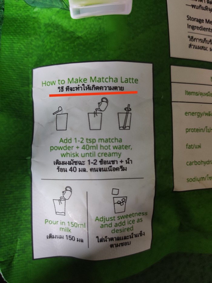 เมื่อวันที่ 14 พฤศจิกายน 2568 ผู้ใช้เฟซบุ๊กรายหนึ่ง ได้เข้าไปโพสต์ในกลุ่ม พวกเราคือผู้บริโภค เล่าว่า สั่งมัทฉะ มาจากแอปฯ พออ่านวิธีทำด้านหลังแล้วมันเขียนผิดหรือแปลผิดกันแน่ โดยจากภาพเผยให้เห็นซองมัทฉะแบบผง หน้าซองมีภาษาอังกฤษและภาษาญี่ปุ่น ส่วนด้านหลังมีภาษาอังกฤษและภาษาไทย ซึ่งดูเผิน ๆ อาจจะดูไม่ผิดปกติอะไร