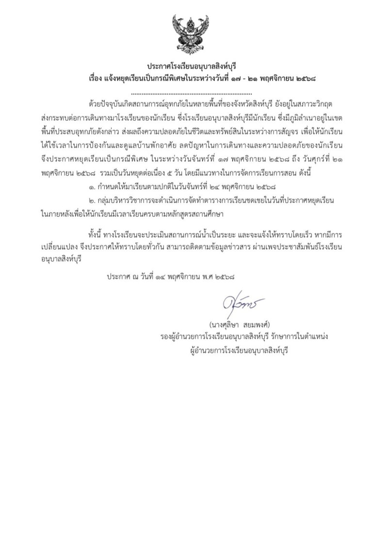 เมื่อวันที่ 15 พฤศจิกายน 2568 มีรายงานว่า ศูนย์ประชาสัมพันธ์โรงเรียนอนุบาลสิงห์บุรี ได้ออกประกาศ แจ้งหยุดเรียนเป็นกรณีพิเศษ ผ่านเพจเฟซบุ๊ก Anuban Singburi โรงเรียนอนุบาลสิงห์บุรี โดยระบุว่า ประกาศโรงเรียนอนุบาลสิงห์บุรี เรื่อง แจ้งหยุดเรียนเป็นกรณีพิเศษ เนื่องจากสถานการณ์อุทกภัย
