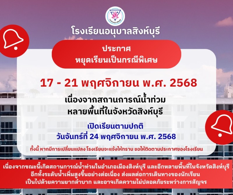 เรียน ท่านผู้ปกครองนักเรียนโรงเรียนอนุบาลสิงห์บุรีที่เคารพทุกท่าน ตามที่จังหวัดสิงห์บุรีได้ประสบกับสถานการณ์อุทกภัยอย่างต่อเนื่อง และหลายพื้นที่ยังคงอยู่ในสภาวะวิกฤต ซึ่งส่งผลกระทบโดยตรงต่อความสะดวกและความปลอดภัยในการเดินทาง มาโรงเรียนของนักเรียนเป็นอย่างยิ่ง