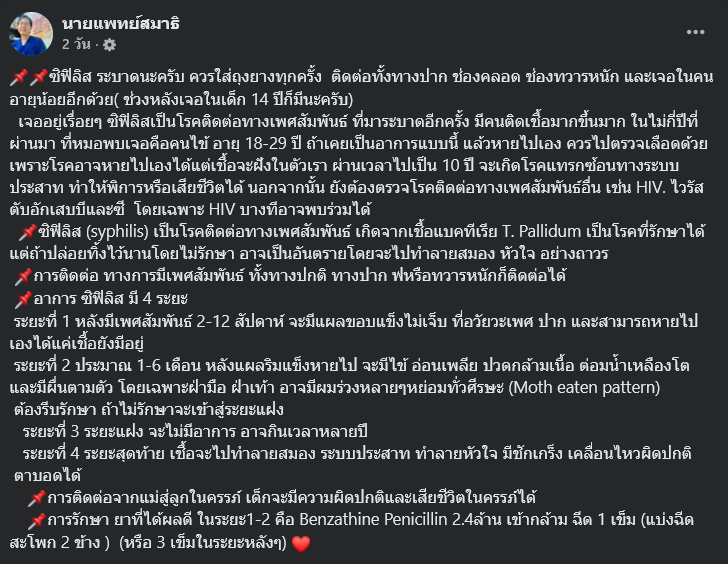 นายแพทย์สมาธิ นิชานนท์ แพทย์เฉพาะทางรักษาโรคทั่วไปและโรคเกี่ยวกับผิวหนัง โพสต์เตือน ซิฟิลิส โรคติดต่อทางเพศสัมพันธ์ กลับมาระบาดหนัก แนะนำใส่ถุงยางป้องกัน หมั่นเช็กอาการ โดยระบุว่า "ซิฟิลิส ระบาดนะครับ ควรใส่ถุงยางทุกครั้ง ติดต่อทั้งทางปาก ช่องคลอด ช่องทวารหนัก และเจอในคนอายุน้อยอีกด้วย (ช่วงหลังเจอในเด็ก 14 ปี)"