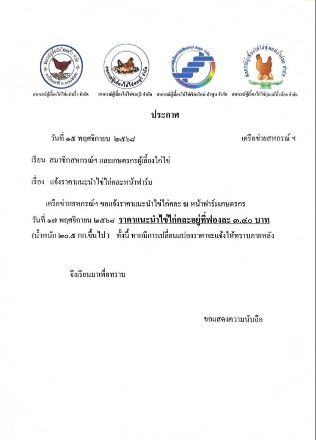 เครือข่ายสหกรณ์ผู้เลี้ยงไก่ไข่ ซึ่งประกอบด้วย สหกรณ์ผู้เลี้ยงไก่ไข่แปดริ้ว จำกัด, สหกรณ์ผู้เลี้ยงไก่ไข่ชลบุรี จำกัด, สหกรณ์ผู้เลี้ยงไก่ไข่เชียงใหม่-ลำพูน จำกัด และสหกรณ์ผู้เลี้ยงไก่ไข่ลุ่มแม่น้ำน้อย จำกัด ได้ออกประกาศแจ้งสมาชิกและเกษตรกรผู้เลี้ยงไก่ไข่เรื่องการปรับขึ้นราคาไข่ไก่คละหน้าฟาร์มอีก 20 สตางค์ต่อฟอง