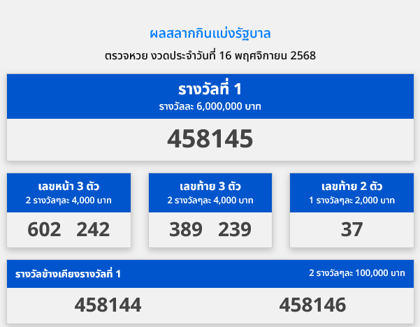 วันที่ 16 พ.ย.68 ภายหลังกองสลากประกาศผลการออกรางวัล สลากกินแบ่งรัฐบาลงวดประจำวันที่ 16 พ.ย.68 โดยรางวัลที่ 1 รางวัลละ 6,000,000 บาท ได้แก่ 458145 เลขหน้า 3 ตัว 2 รางวัลๆละ 4,000 บาท ได้แก่ 602 242 เลขท้าย 3 ตัว 2 รางวัลๆละ 4,000 บาท ได้แก่ 389 239 เลขท้าย 2 ตัว 1 รางวัลๆละ 2,000 บาท ได้แก่ 37