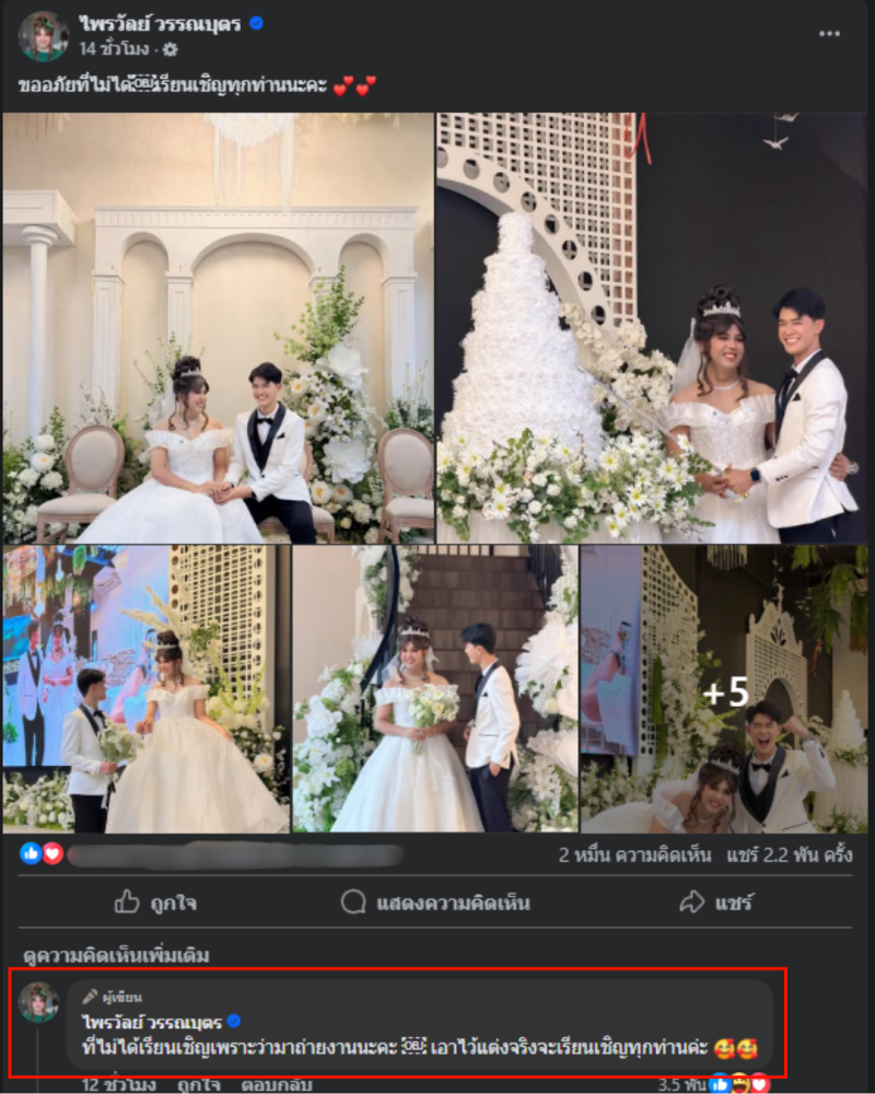ล่าสุด แพรรี่ ไพรวัลย์ ได้ออกมาเฉลยใต้โพสต์ว่า ที่ไม่ได้เรียนเชิญเพราะว่ามาถ่ายงานนะคะ เอาไว้แต่งจริงจะเรียนเชิญทุกท่านค่ะ