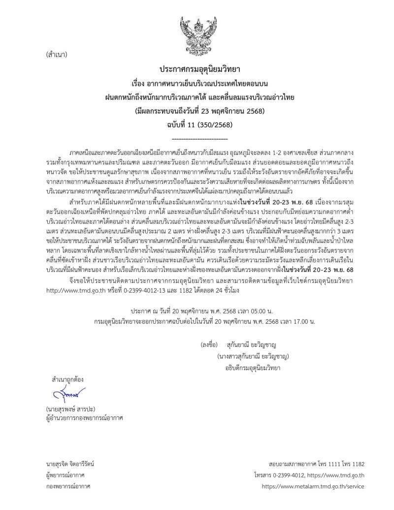 วันที่ 18 พ.ย.2568 กรมอุตุนิยมวิทยา ออกประกาศกรมอุตุนิยมวิทยา เรื่อง อากาศหนาวเย็นบริเวณประเทศไทยตอนบน ฝนตกหนักถึงหนักมากบริเวณภาคใต้ และคลื่นลมแรงบริเวณอ่าวไทย (มีผลกระทบจนถึงวันที่ 23 พฤศจิกายน 2568) ฉบับที่ 11 (350/2568)