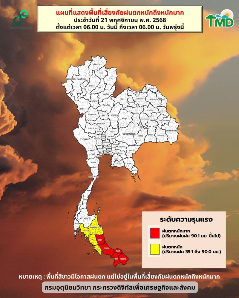 ขอให้ประชาชนในภาคใต้ระวังอันตรายจากฝนตกหนักถึงหนักมากและฝนที่ตกสะสม ซึ่งอาจทำให้เกิดน้ำท่วมฉับพลันและน้ำป่าไหลหลาก โดยเฉพาะพื้นที่ลาดเชิงเขาใกล้ทางน้ำไหลผ่านและพื้นที่ลุ่มไว้ด้วย