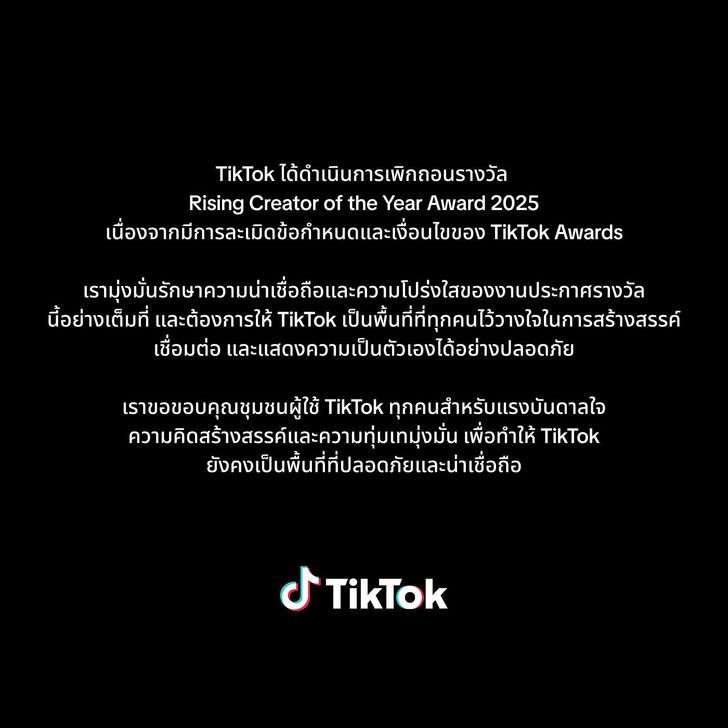 ในประกาศที่เผยผ่านโซเชียลของ TikTok ระบุว่า การตัดสินใจครั้งนี้มีเป้าหมายเพื่อรักษามาตรฐานของ TikTok Awards และทำให้เวทีนี้เป็นพื้นที่ที่ผู้สร้างคอนเทนต์ทุกคนสามารถแสดงศักยภาพอย่างยุติธรรม พร้อมกันนี้ TikTok ยังขอบคุณผู้ใช้ทุกคนที่ร่วมกันสร้างสรรค์คอนเทนต์และช่วยให้แพลตฟอร์มยังคงเป็นพื้นที่ที่ปลอดภัยและน่าเชื่อถือสำหรับทุกคน
