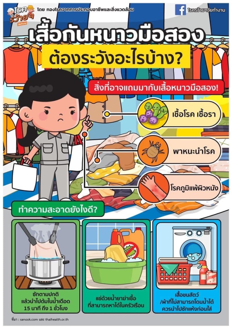 เมื่อวันที่ 22 พฤศจิกายน 2568 สำนักงานป้องกันควบคุมโรคที่ 9 นครราชสีมา ออกมาเตือนว่า ในเสื้อกันหนาวมือสองอาจมีเชื้อโรค หรือพาหะนำโรคติดมากับเสื้อผ้าที่เก็บรวมกันนานๆ หากไม่ทำความสะอาดก่อน อาจส่งผลกระทบต่อสุขภาพของผู้สวมใส่ได้ มี 3 โรค ได้แก่