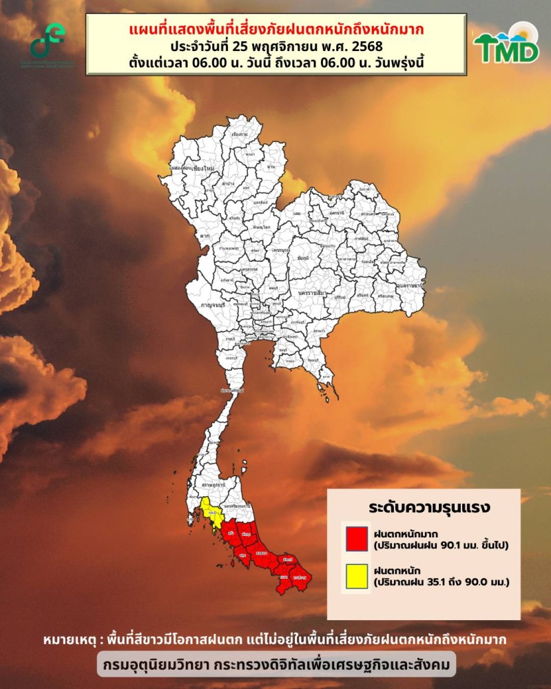 ออกประกาศ 25 พฤศจิกายน 2568 พยากรณ์อากาศสำหรับประเทศไทย 06:00 น. วันนี้ ถึง 06:00 น. วันพรุ่งนี้