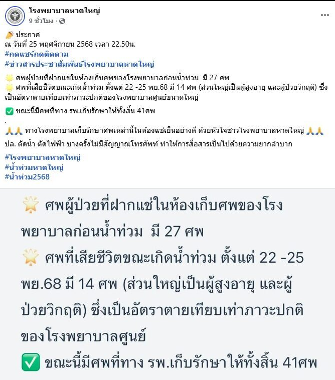 เมื่อวันที่ 26 พ.ย.68 เฟซบุ๊ก โรงพยาบาลหาดใหญ่ ชี้แจงกรณีผู้เสียชีวิตจากเหตุการณ์น้ำท่วม โดยระบุว่าวันที่ 25 พ.ย.68 เวลา 22.50 น. ทางโรงพยาบาลมีศพผู้ป่วยที่ฝากแช่ในห้องเก็บร่างของโรงพยาบาลก่อนน้ำท่วม จำนวน 27 ร่าง